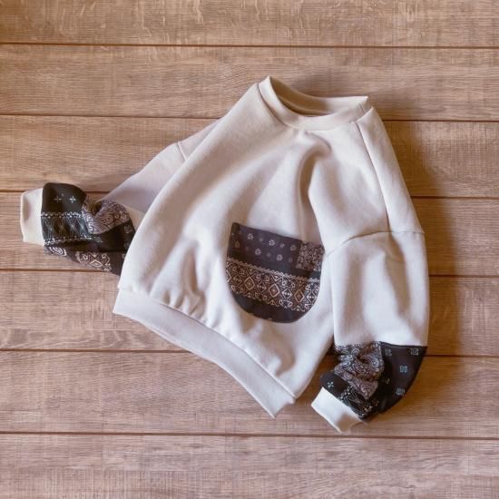 ユーク付けた斜めのポケットが可愛い長袖トレーナーと半袖Tシャツの型紙です。